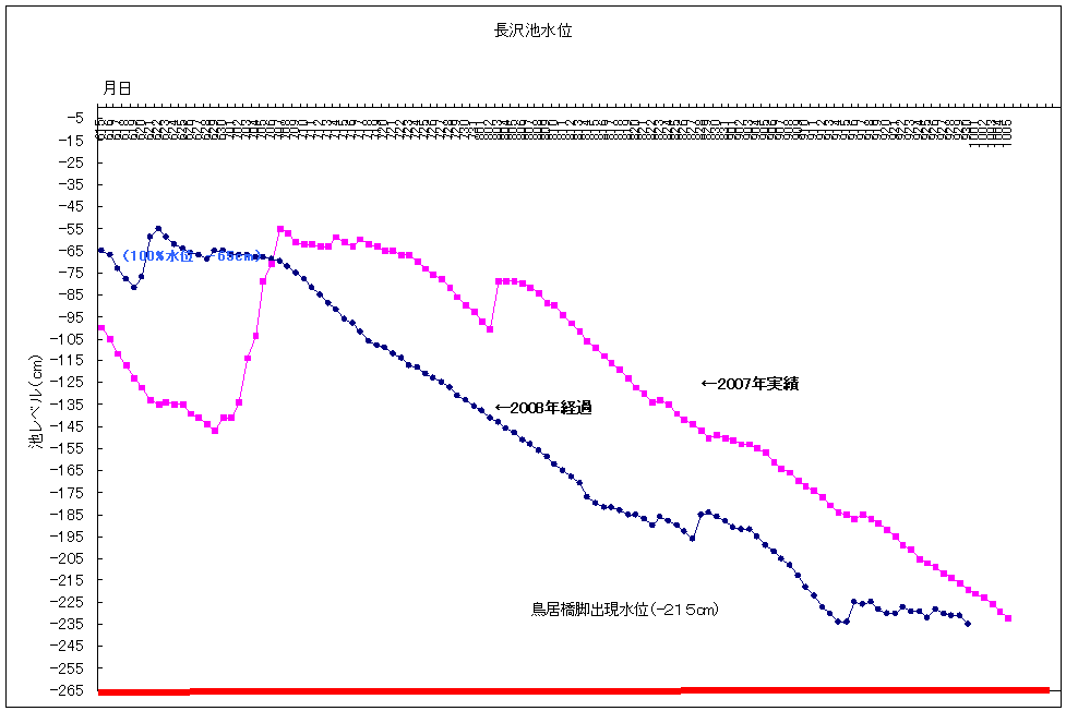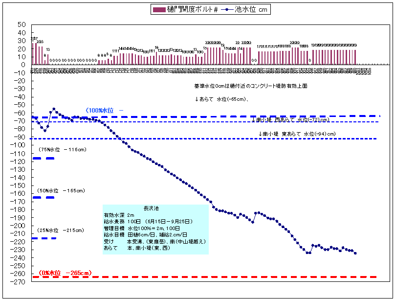 8月1日最近雨が降らない、貯水量は昨年よりー70cm、給水減を世話人さんへ連絡