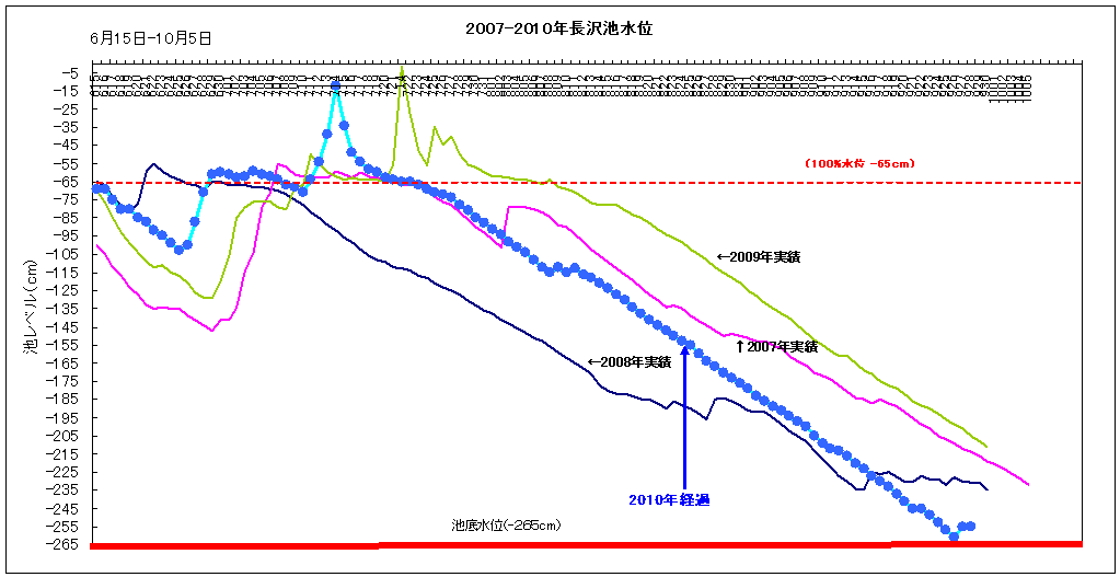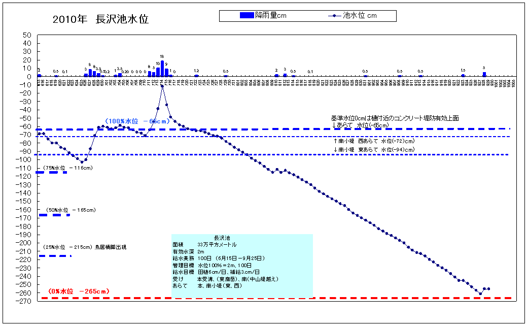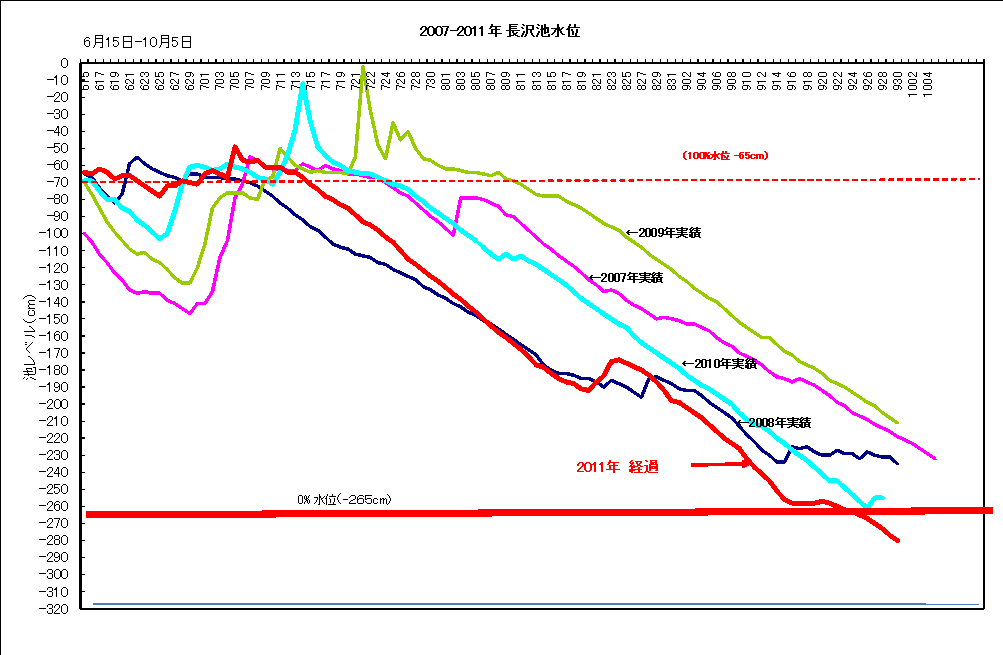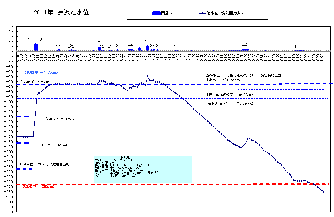 長沢池 概要 面積 33万m2 有効水深 2.0m 100日分 2.0m 50日分 1.0m 25日分 0.5m 地区水田に 6月15日から9月25日の 100日間供給可能な水量を確保。 (2011年は6月10日 開門) 2008 0701 |