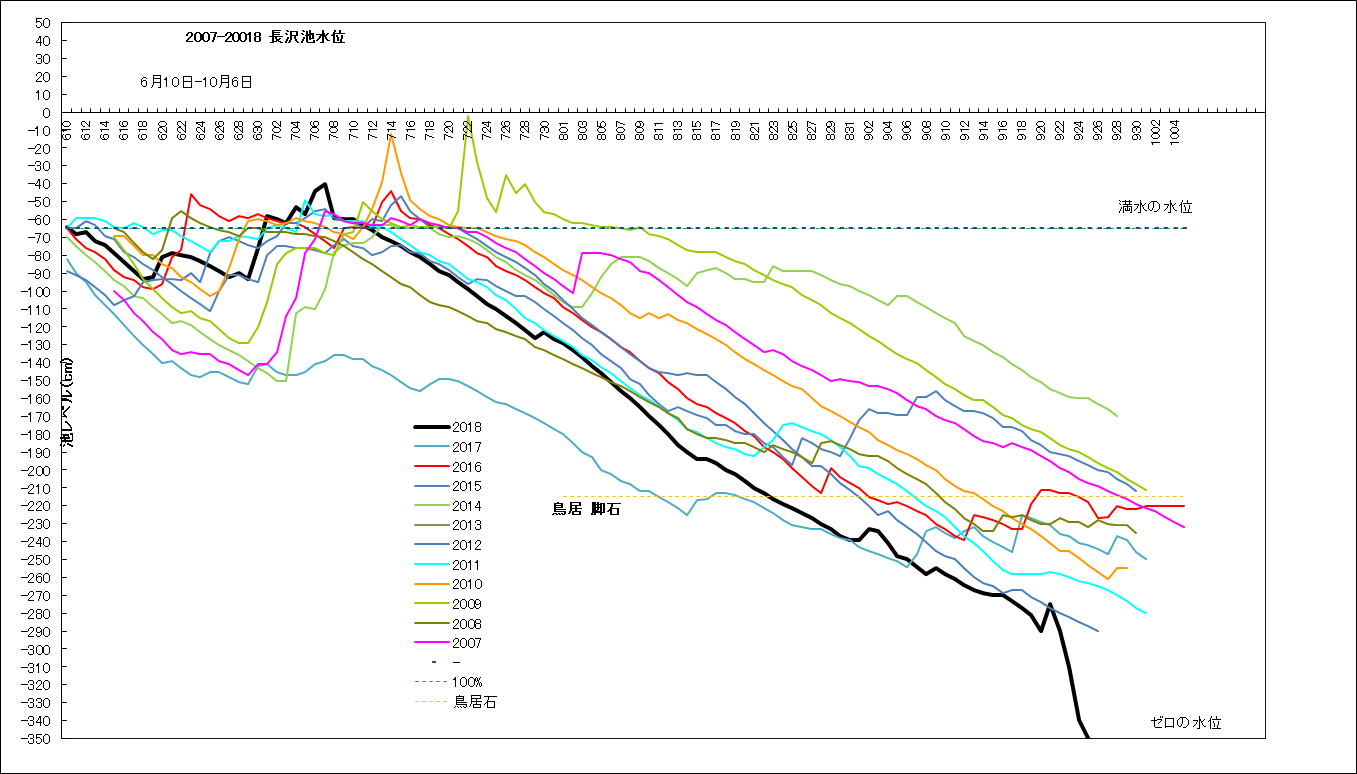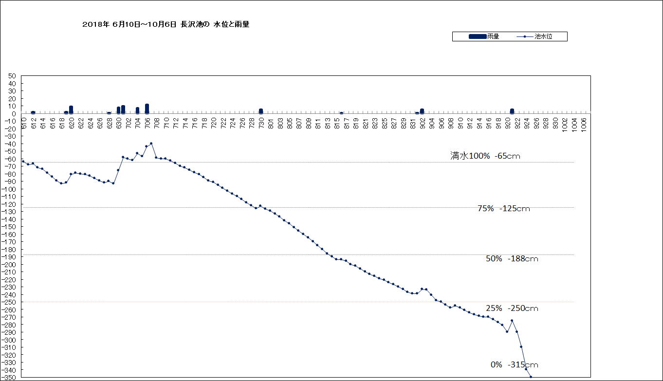 長沢池 概要 面積 33万m2 有効水深 2.5m 地区水田に 6月10日から9月25日の 100日間供給可能な水量を確保。 (2011年以降は6月10日 開門) 2008 0701 |