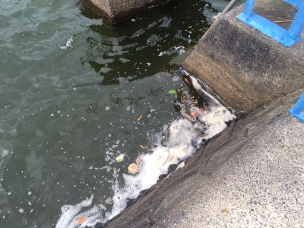 | 2018 0722 風が吹く日に泡立つ いわゆる波の花の水質を測定。機材はパックテスト 結果は 約7.5 そんなに悪い値ではない。特段の異変ではないようだ。 | |